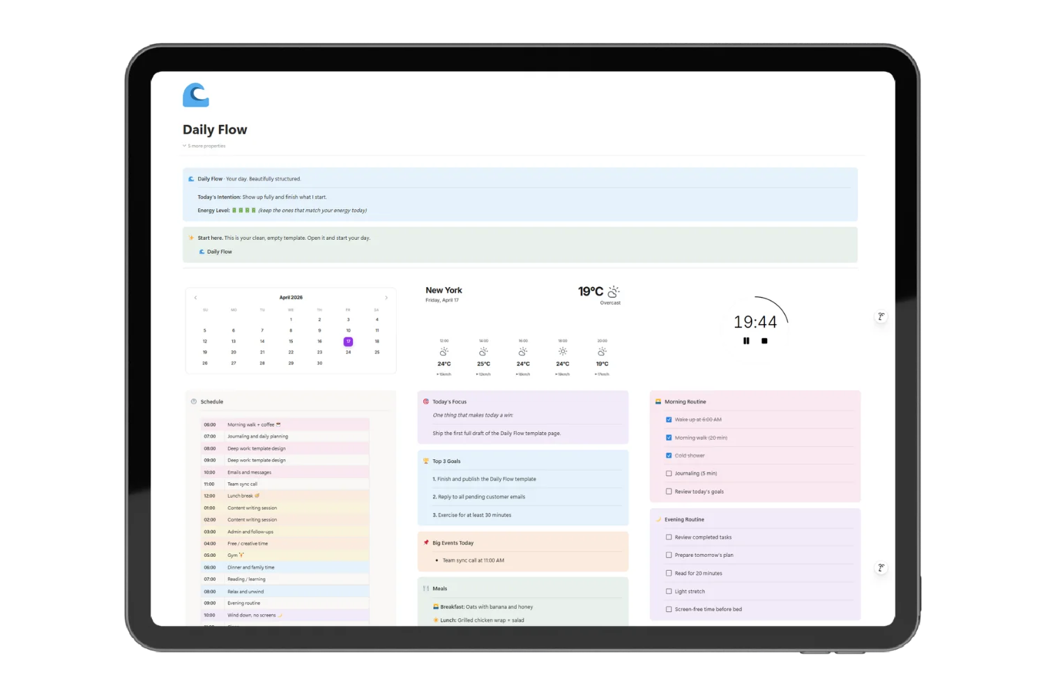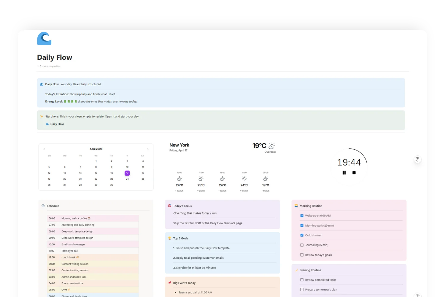 Other Notion planners are either too minimal (just a checklist) or too complex (15 databases, 40 properties). Daily Flow hits the exact middle: structured enough to create clarity, simple enough to actually use every day.