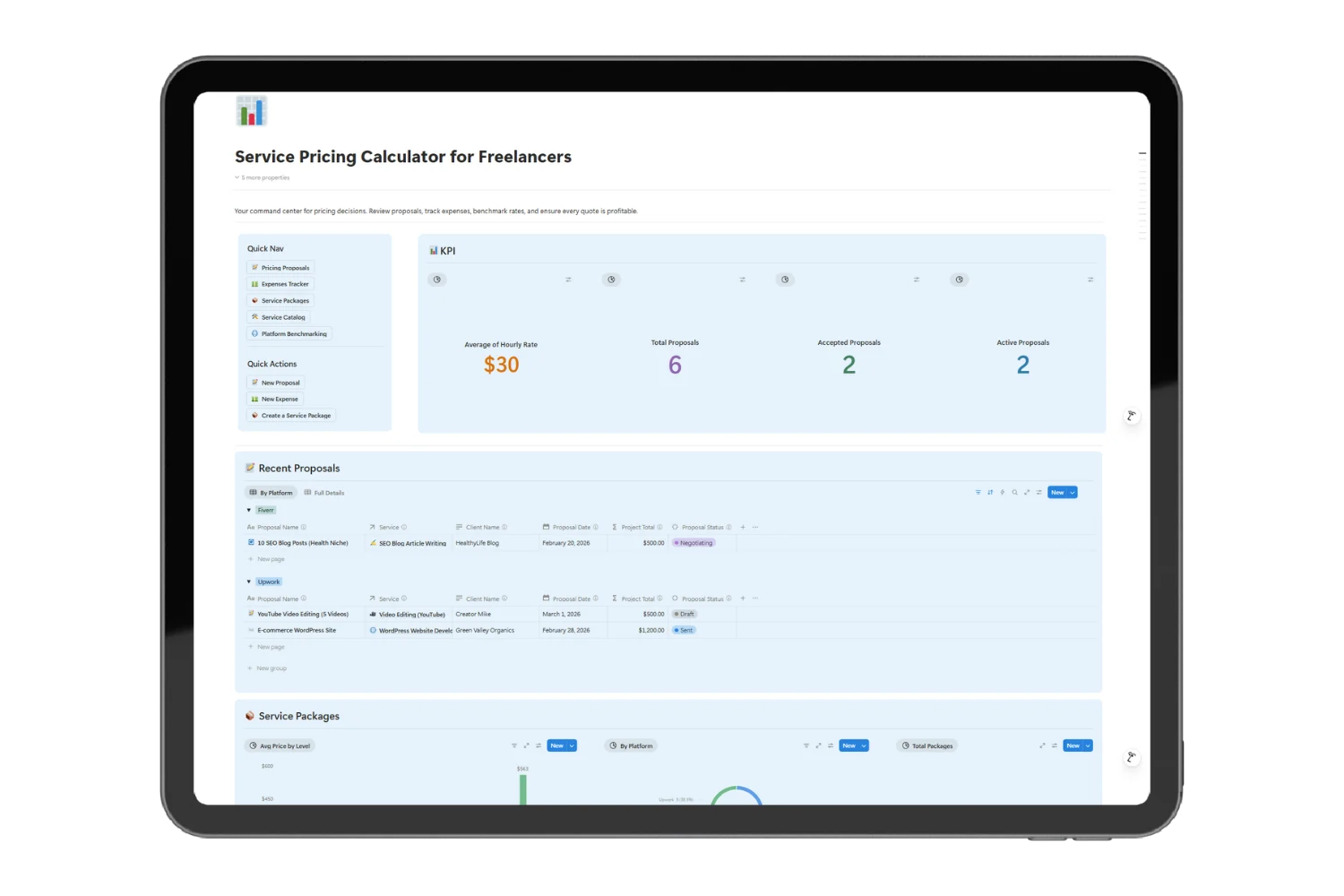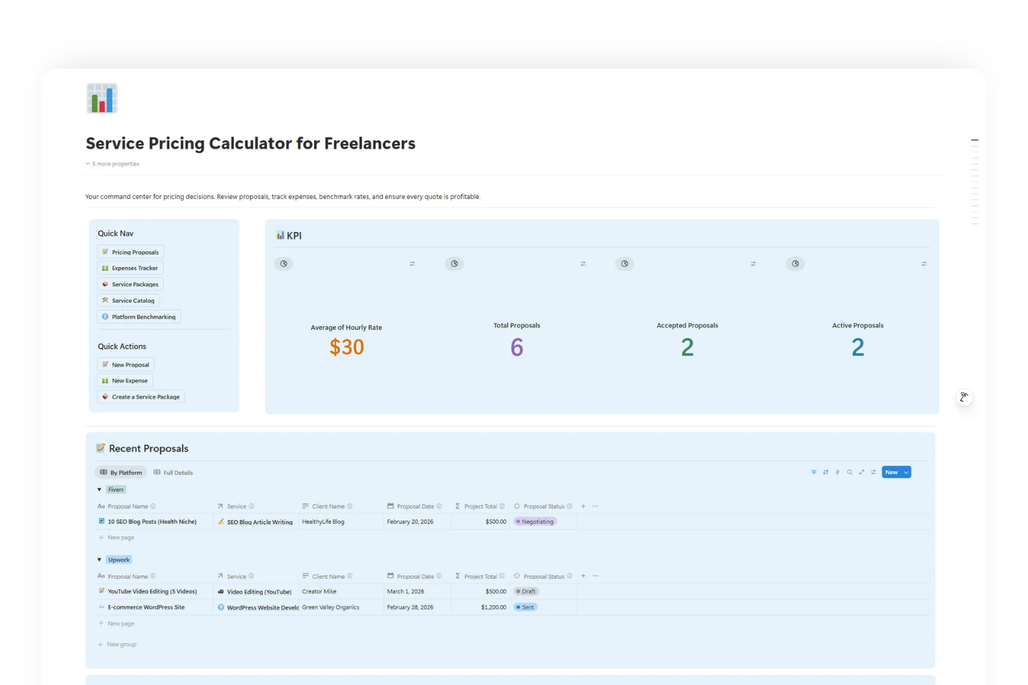 This freelance pricing calculator is the complete system: pricing, proposals, packages, market research, expense tracking, and a live dashboard — all in one Notion workspace.